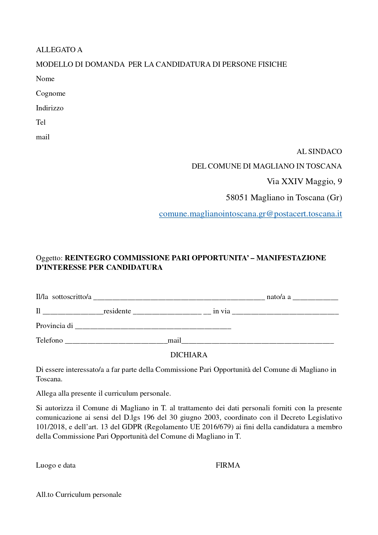 Invita chiunque interessato/a a far parte della Commissione Pari Opportunità del Comune di Magliano in T. a presentare la propria candidatura, su apposita istanza, corredata di curriculum personale.