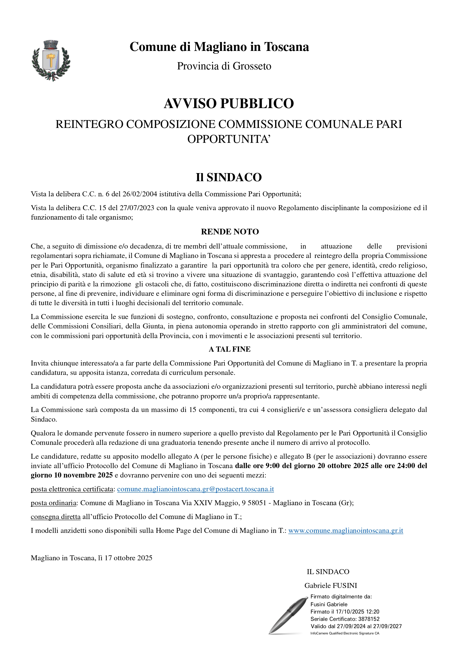 Le candidature, redatte su apposito modello allegato A (per le persone fisiche) e allegato B (per le associazioni) dovranno essere inviate all’ufficio Protocollo del Comune di Magliano in Toscana dalle ore 9:00 del giorno 20 ottobre 2025 alle ore 24:00 del giorno 10 novembre 2025 e dovranno pervenire con uno dei seguenti mezzi: